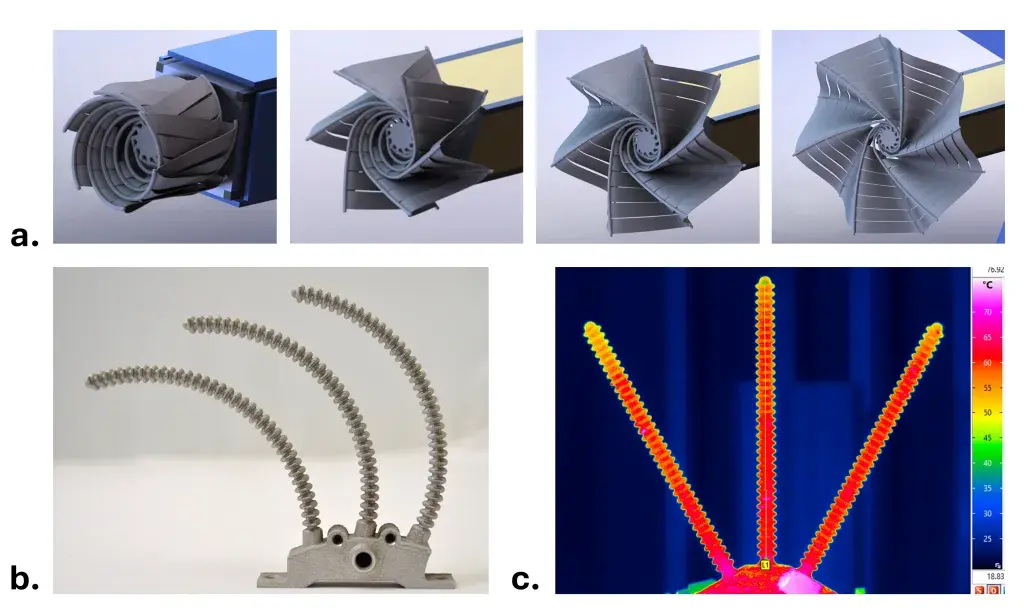 Figura 2: a. Concetto per radiatore in lega a memoria di forma (SMA) realizzato mediante produzione additiva con diramazioni radiali del tubo termico che si dispiegano da una forma compatta riposta; b.Dimostratore del prototipo SMA con bracci a soffietto altamente conformi; c. Immagine termica del tubo termico SMA a soffietto ramificato, che mostra un funzionamento quasi isotermico (immagini fornite dalla Penn State University).